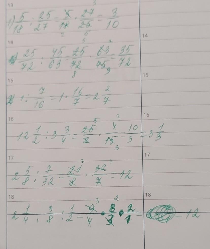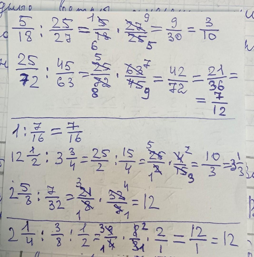 пожалуйста помогите, 1) 5/18 : 25/27, 25/72 :45/63 2)1 :7/16, 12 1/2 : 3 3/4, 2 5/8 :7/32, 3) 2 1/4 : 3/8 : 1/2 ПОЖАЛУЙСТА ПОМОГИТЕ! ОТДАМ 90 БАЛЛОВ (надо писать действием а не просто ответ)