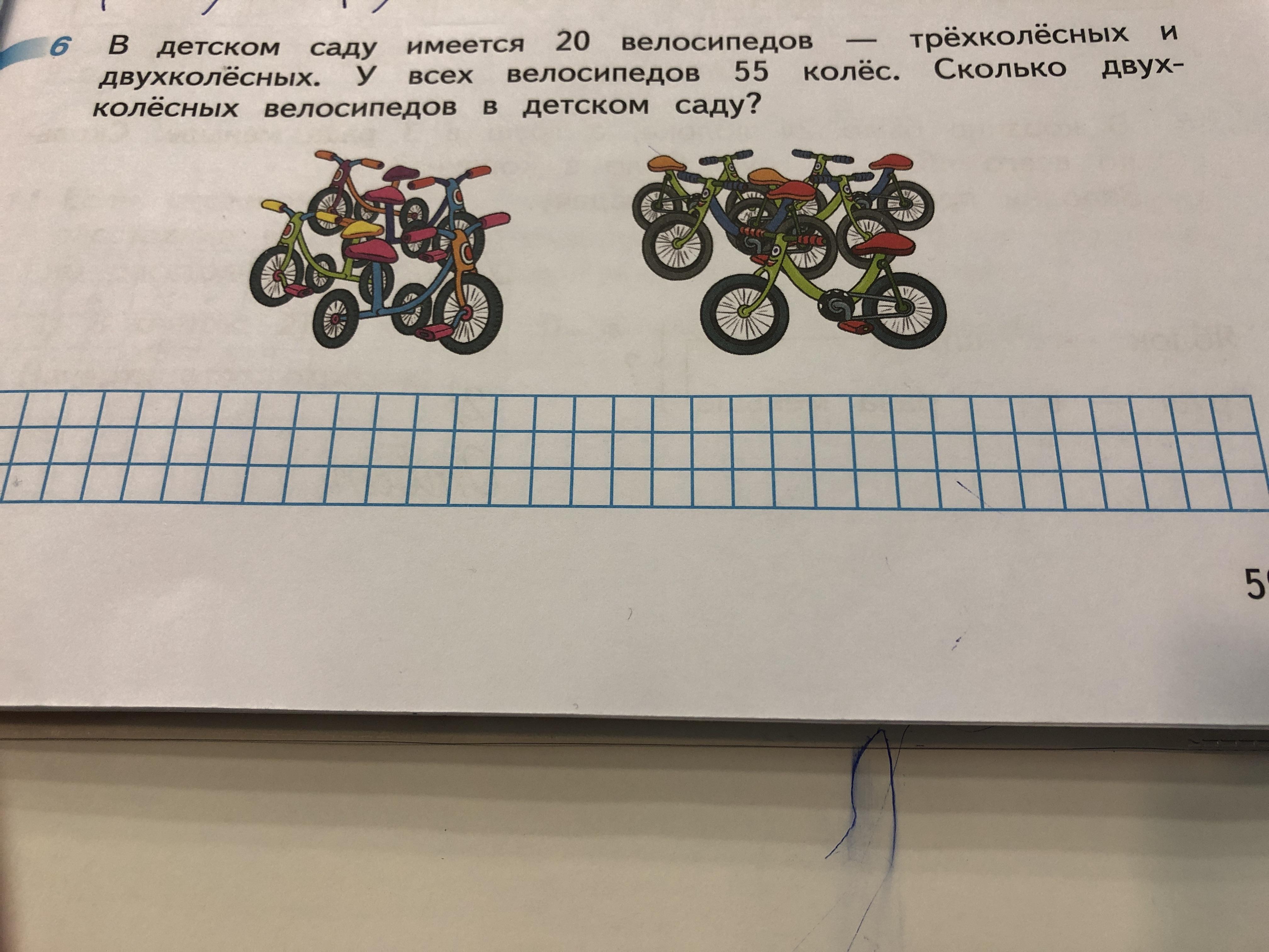 В детском саду имеется 12 велосипедов – трёх колёсных и двухколёсных. У всех велосипедов 55 колёс. Сколько двух колёсных велосипедов в детском саду?( Решите пожалуйста ) ( отдам 60 баллов)