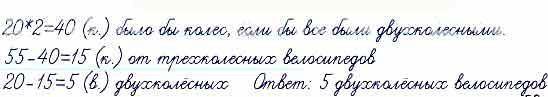 Эти колеса (по одному на каждый) нужно добавить к 15 велосипедам, то есть переделать их из двухколесных в трехколесные. Тогда получится 15 трехколесных велосипедов, и останется 20-15=5 двухколесных велосипедов.