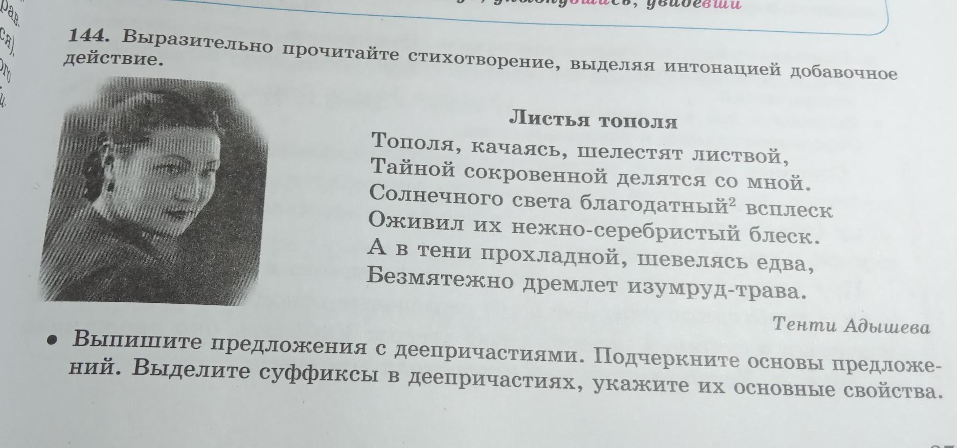 144. Выразительно прочитайте стихотворение, выделяя интонацией добавочное действие. ㅤㅤㅤㅤЛистья тополя Тополя, качаясь, шелестят листвой, Тайной сокровенной делятся со мной. Солнечного света благодатный? всплеск Оживил их нежно-серебристый блеск. А в тени прохладной, шевелясь едва, Безмятежно дремлет изумруд-трава. • Выпишите предложения с деепричастиями. Подчеркните основы предложе- ний. Выделите суффиксы в деепричастиях, укажите их основные свойства.