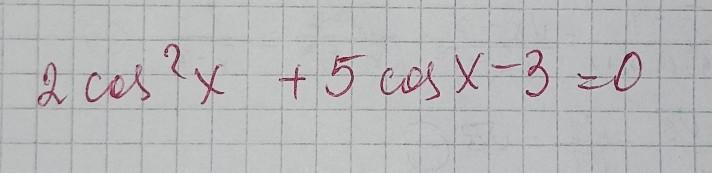 Пусть cosx=y, тогда получим квадратное уравнение: 2у^2+5у-3=0 находим дискриминант: Д=5^2-4*2*(-3)=25+24=49 у1=(-5+√49)/(2*2)=(-5+7)/4=2/4=1/2 у2=(-5-√49)/(2*2)=(-5-7)/4=-12/4=-3 Возвращаемся к замене, получим 2 уравнения: 1)cosx=-3 решений не имеет. так как значение cosx лежит в промежутке [-1;1] 2)cosx=1/2 x=±arccos(1/2)+2πn, где n принадлежит Z x=±π/3 +2πn, где n принадлежит Z