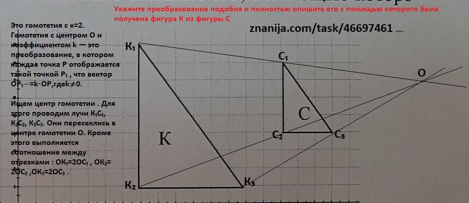 Ищем центр гомотетии . Для этого проводим лучи К₁С₁, К₂С₂, К₃С₃. Они пересеклись в центре гомотетии О. Кроме этого выполняется соотношение между отрезками : ОК₁=2ОС₁ , ОК₂=2ОС₂ , ОК₃=2ОС₃ .