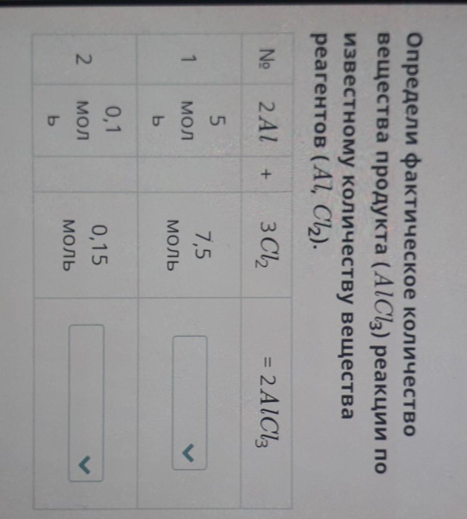 Определи фактическое количество вещества продукта (AlCl3) реакции по известному количеству вещества реагентов (Al, Cl2).