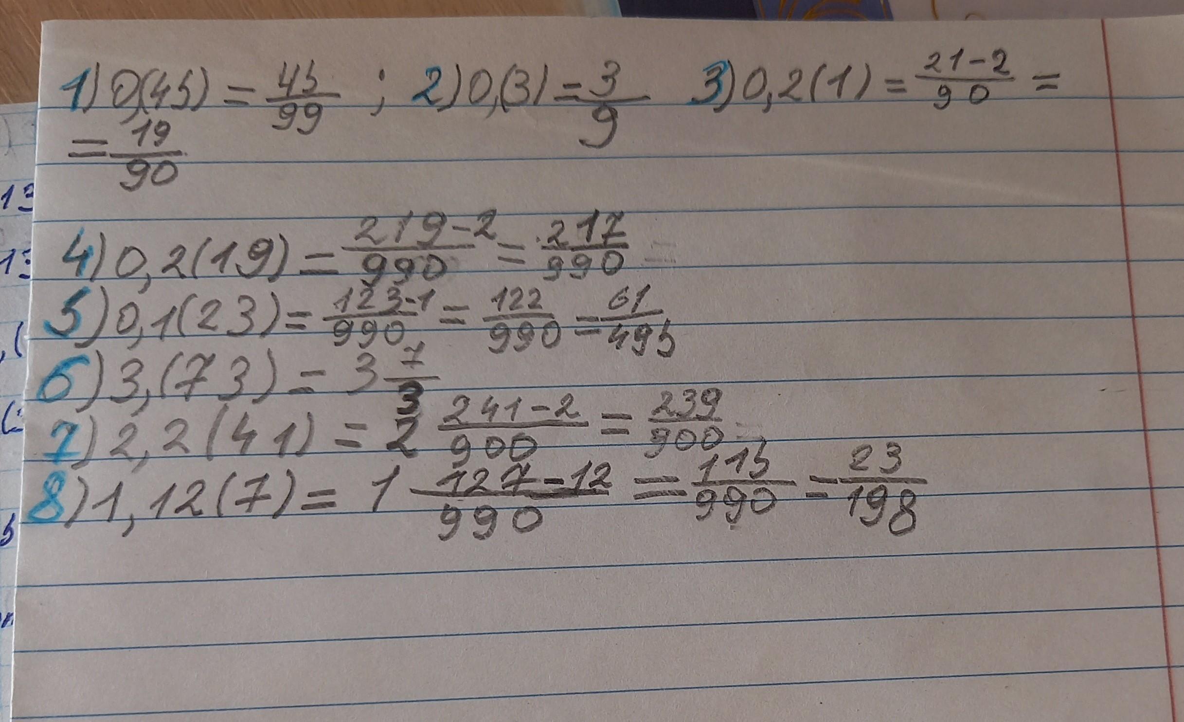 Переодическую дробь в обыкновенную дробь: . 1)0,(45) • 2)0,(3) . 3)0,2(1) 4)0,2(19) 5)0,1(23) . 6)3,(73) 7)2,2(41) 8)1,12(7)