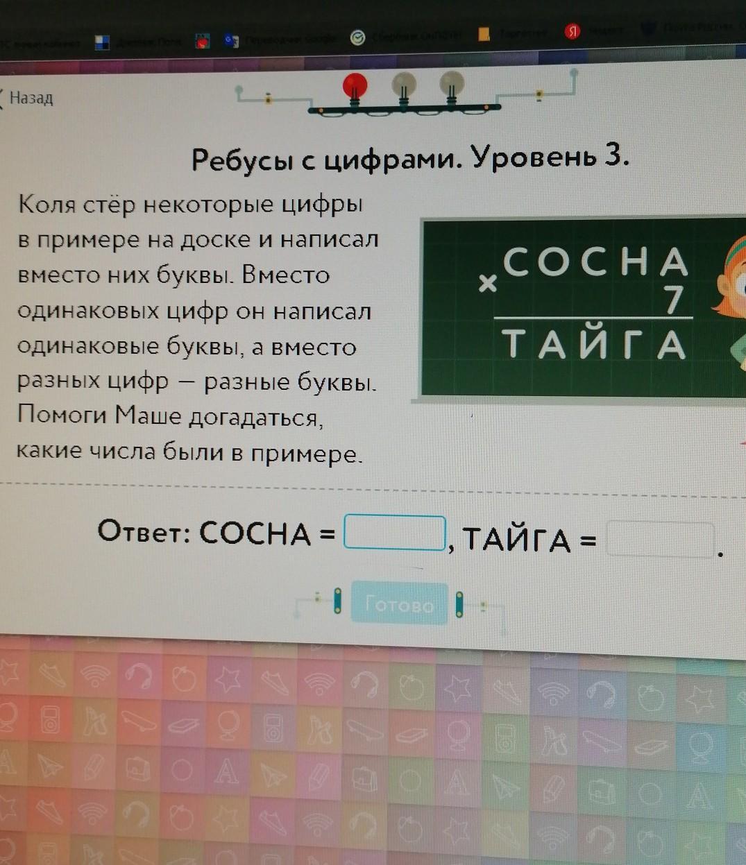 р Я) ( Назад С 21 9 A O AD 05 о O Ребусы с цифрами. Уровень 3. Коля стёр некоторые цифры В примере на доске и написал СОСНА Вместо них буквы. Вместо 7 одинаковых цифр он написал одинаковые буквы, а вместо ТАЙГА разных цифр — разные буквы. Помоги Маше догадаться, какие числа были в примере. 3 3 3 g О. А СО ТОМ ТОМ о ТАЙГА = Ответ: СосHA = — (CO o 3 . Готово о (о 2 3 9 9 3 O A O AD (а) ас O A D 5 а 2 O 2 O ДО ДОМА -)) да ОК О. а а a a ENES Адрес с . о PC