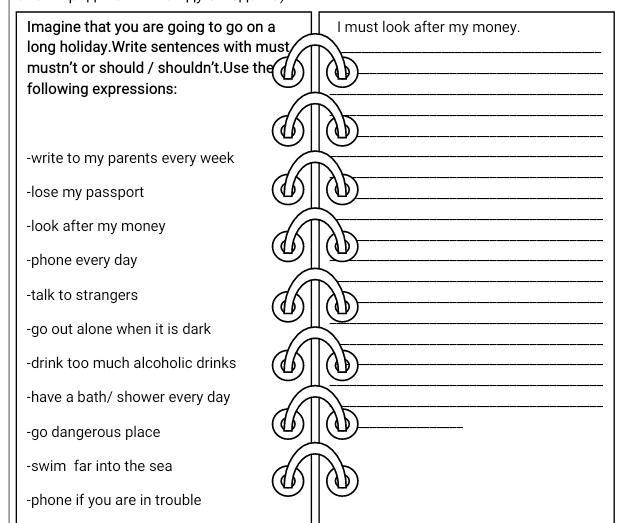 Представьте, что вы собираетесь куда-то на долгие каникулы. Составьте предложения, используя модальные глаголы must/mustn`t, should/shouldn`t (что должны и не должны делать во время каникул) и следующие выражения (ниже). For example: I must write to my parents every week. (Я должен писать своим родителям каждую неделю).