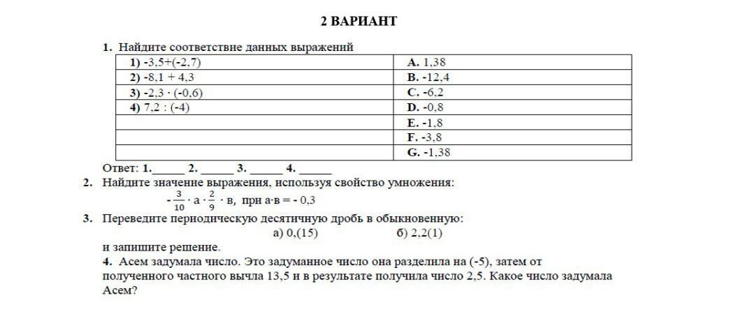 1) 1-С, 2-F, 3-A, 4-E, 2) =-3/10*2/9*(-3/10)=1/50, 3) =15/99=5/33, =(21-2)/90=19/90, 4) х:(-5)-13,5=2,5; х:(-5)=16, х=-80