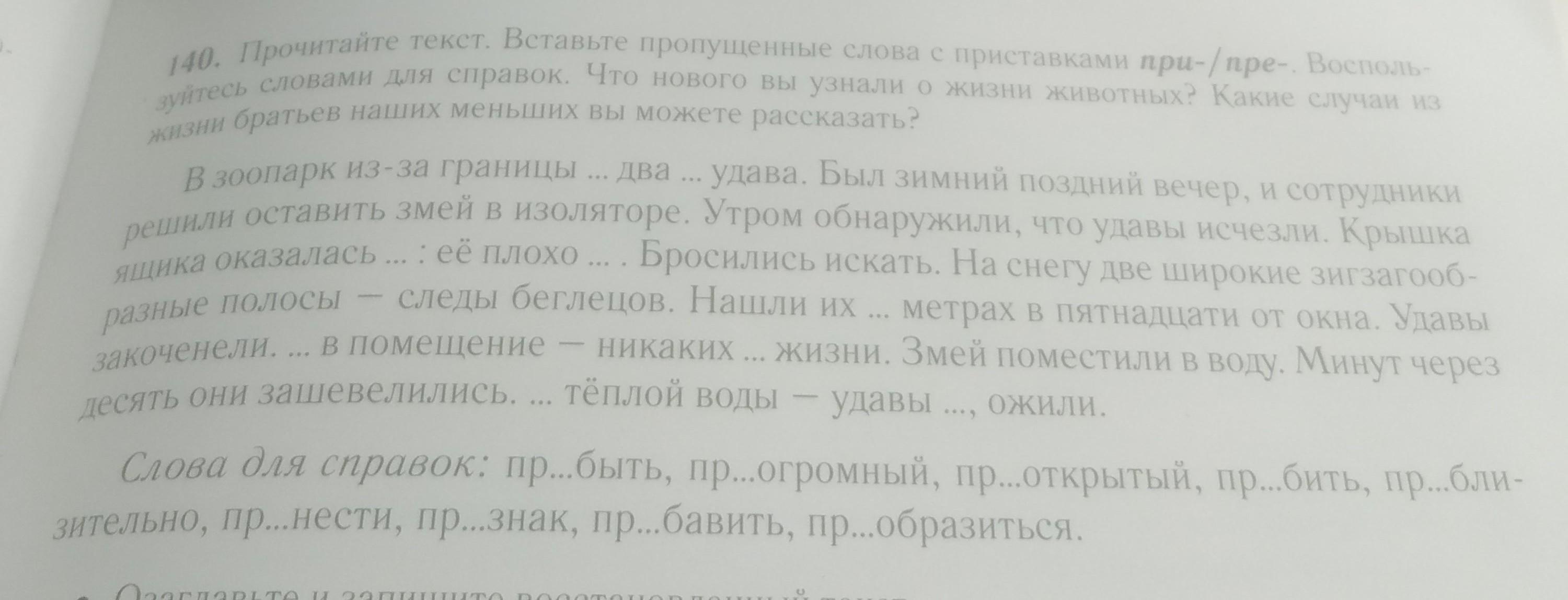 прочитайте текст.Вставьте пропущенные слова с приставками при-/пре-.Воспользуйтесь словами для справок. что нового вы узнали о жизни животных ?Какие случаи из жизни братьев наших меньших вы можете рассказать?
