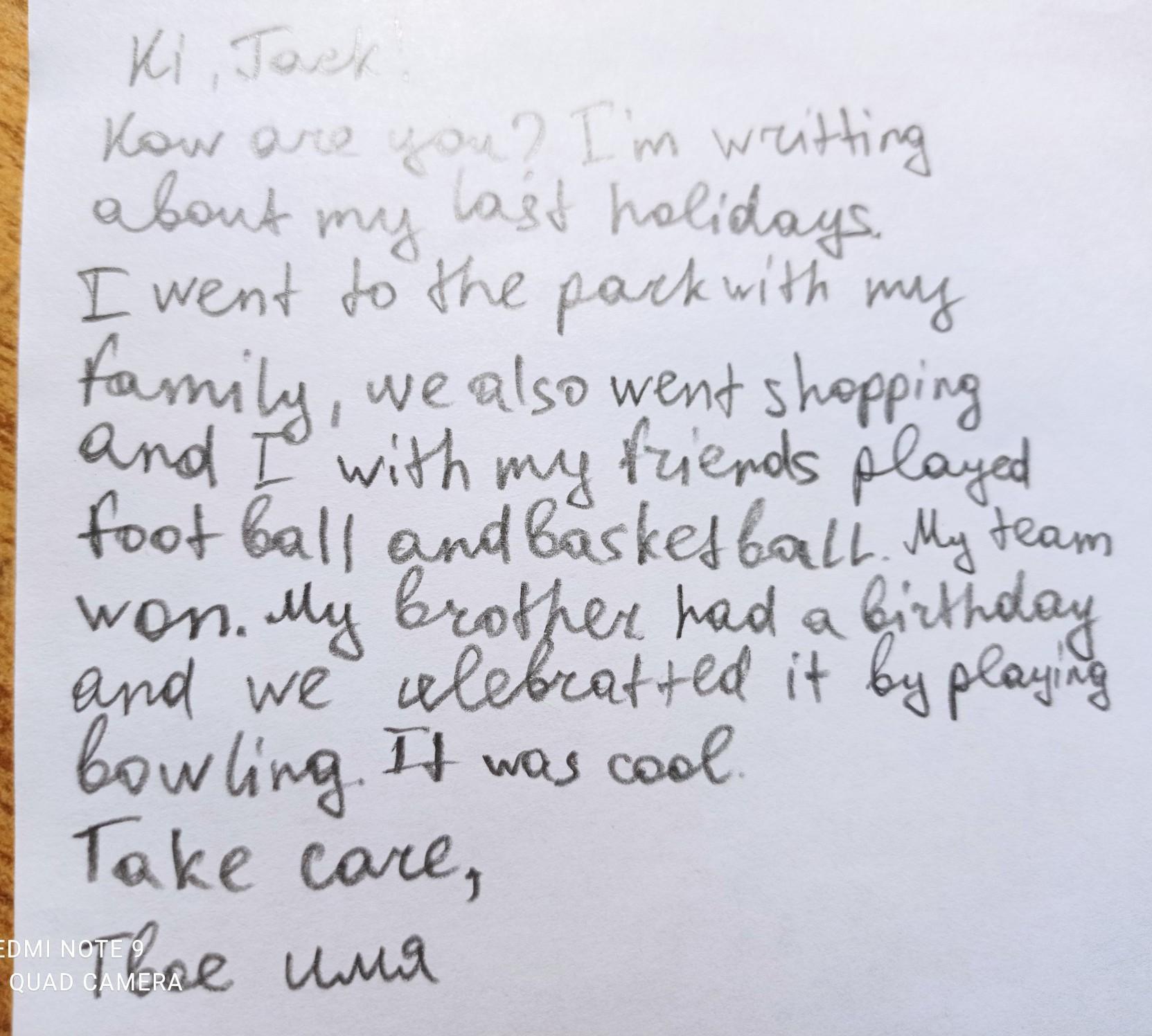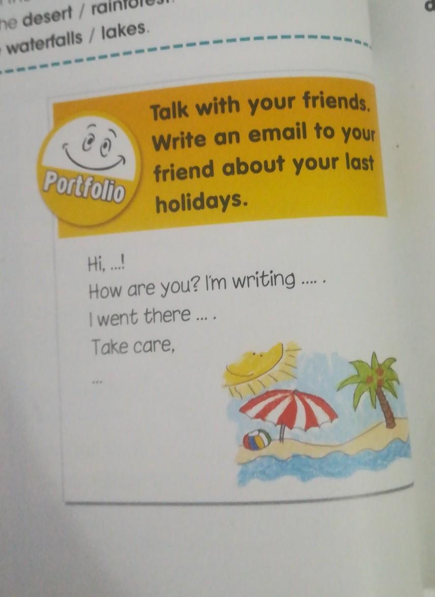 Talk with your friends Write an email to you friend about your last holidays. Portfolio How are you? im writing..... went there Take care