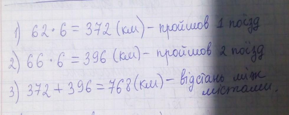 б) з двох міст одночасно назустріч один одному вийшли два поїзди і зу- стрілися через 6 годин після початку руху. Швидкість одного поїзда 62 км/год, швидкість другого 66 км/год Знайти відстань між містами . Срочно