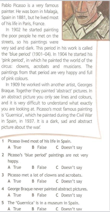 Пабло Пикассо - очень знаменитый художник. Он родился в городе Малага, который находится в Испании, в 1881 году, но он прожил большую часть своей жизни во Франции, в Париже (1).