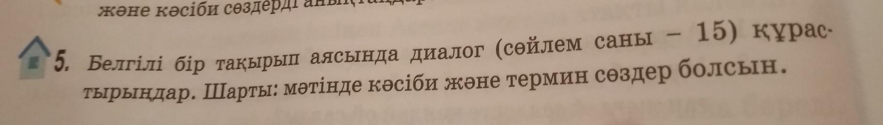 5. Белгілі бір тақырып аясында диалог (сөйлем саны – 15) құрастырыңдар. Шарты: мәтінде кәсіби және термин сөздер болсын