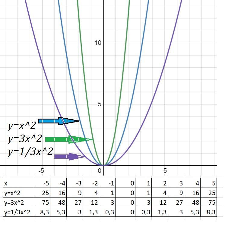 Постройте в одной координатной плоскости графики функций y=x^2,y=3x^2,y=1/3x^2 и сравните. Какая из парабол "шире" и какая "уже"?