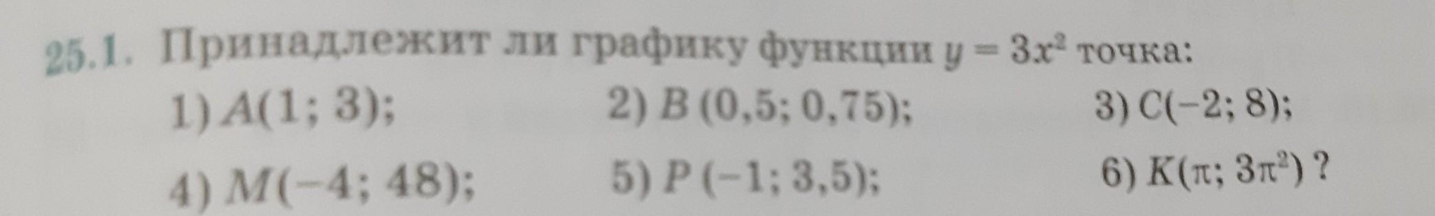 1) 3=3×1²;. 3=3 точка А принадлежит. 2)0,75=3×0,5². 0,75=0,75 точка В принадлежит. 3) 8=3×(-2)² 8≠12 точка С не принадлежит. 4) 48=3×(-4)². 48=48 точка М принадлежит. 5) 3,5≠3×1². 3,5≠5 точка Р не принадлежит. 6) 3п²= 3п², точка К принадлежит.