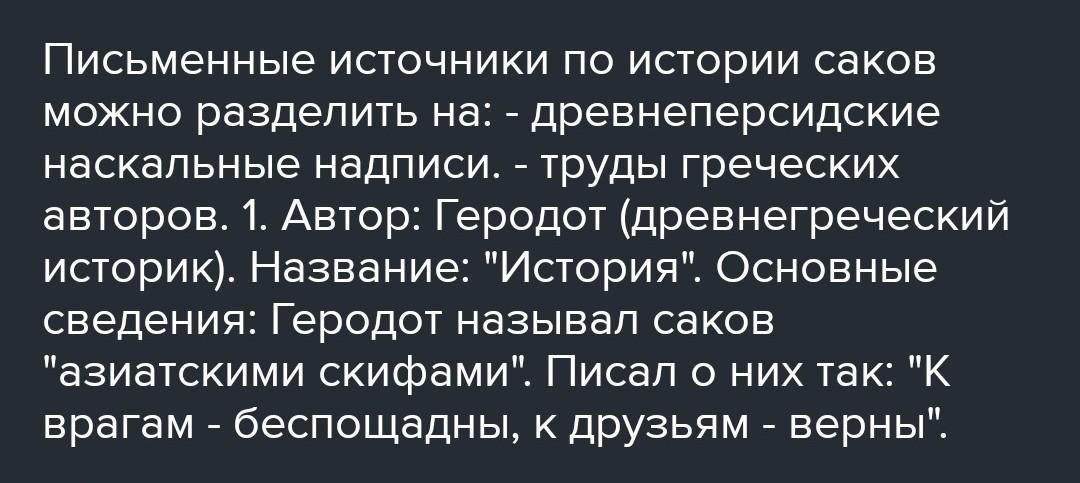 1. Автор: Геродот (древнегреческий историк). Название: "История". Основные сведения: Геродот называл саков "азиатскими скифами". Писал о них так: "К врагам - беспощадны, к друзьям - верны".