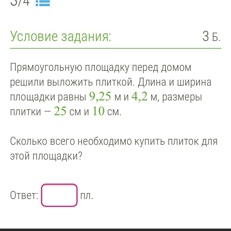 Ответ: Пусть S - площадь площадки, - площадь одной плитки, n - количество плиток. Площадь прямоугольника по формуле это произведение длинны на ширину.