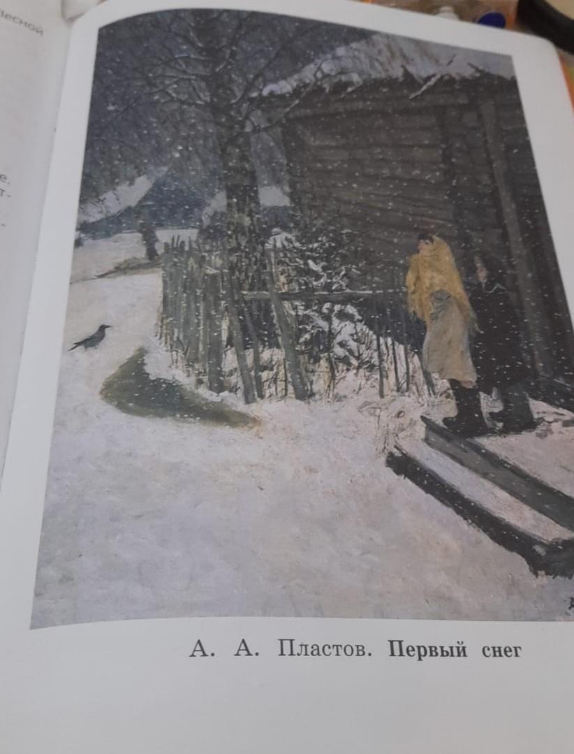 Здесь это сестра и ее младший братишка. они сквозь заиндевевшее стекло увидели снегопад и быстренько одевшись, выбежали на крыльцо, чтобы ощутить свою сопричастность такому событию. Желтую теплую шаль девочка даже не успела завязать, только набросила на легкое домашнее платьице. Но на ногах у нее валенки, чтобы не замерзли ноги. Девочка, точно струна, вся вытянулась, запрокинув голову, она смотрит на снег. На лице детский восторг преображением окружающего ее мира.