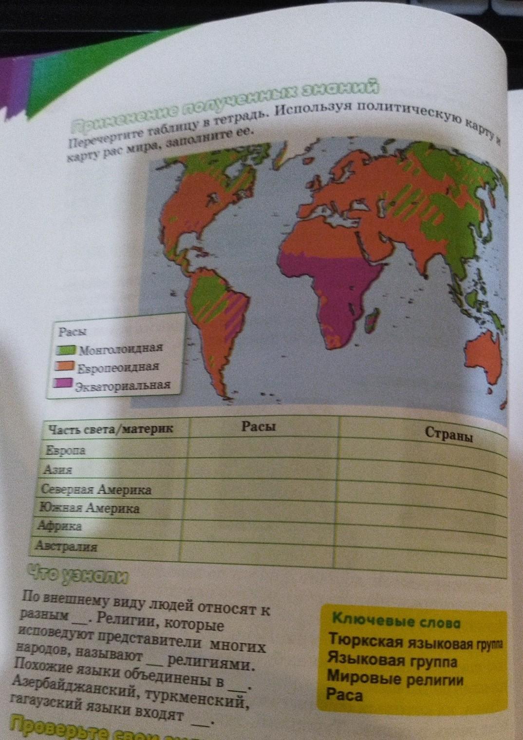 Ответ: европа-европеоидная;азия-монголоидная,европеоидная;Северная Южная америка и Африка-все представленные расы;