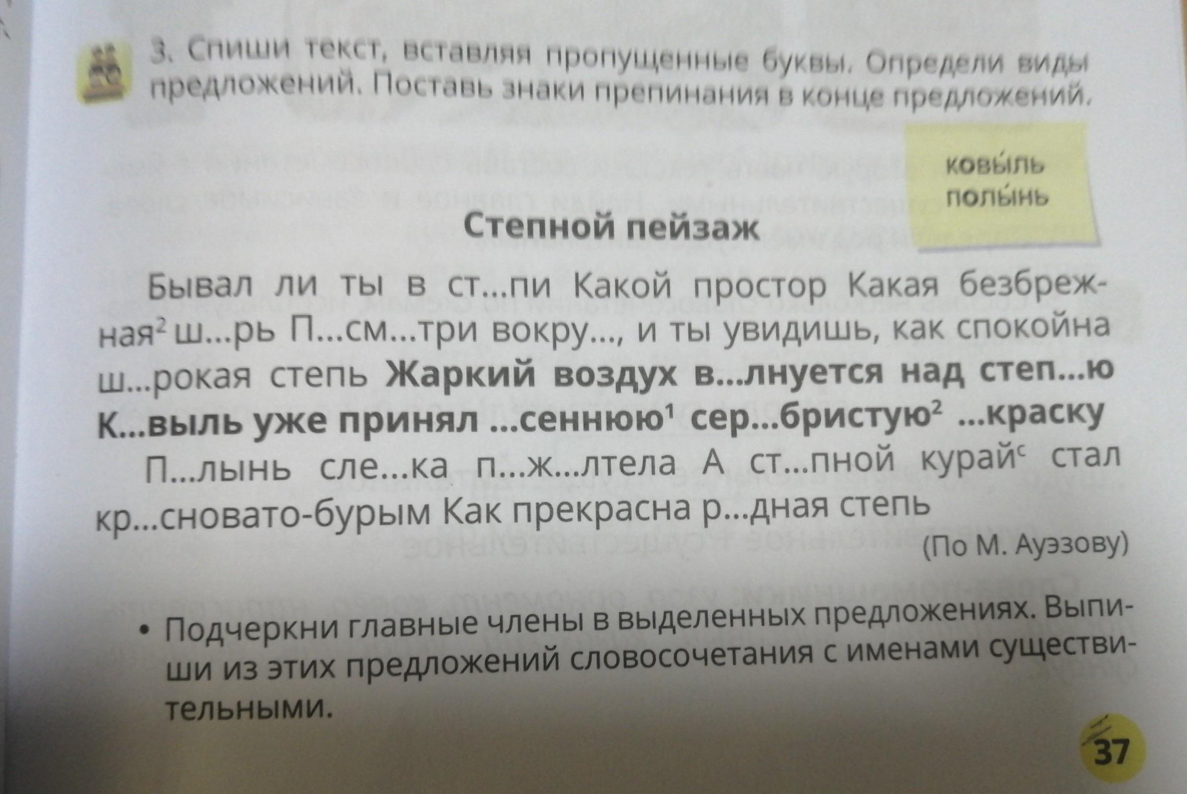 3. Спиши текст, вставляя пропущенные буквы. Определи виды предложений. Поставь знаки препинания в конце предложений. Ковыль полынь Степной пейзаж Бывал ли ты в ст...пи Какой простор Какая безбреж- ная? ш...рь П...см...три вокру..., и ты увидишь, как спокойна ш...рокая степь Жаркий воздух в...лнуется над степ...ю К...выль уже принял ...сеннюю сер...бристую? ...краску П...Лынь сле...ка п...ж...лтела Аст...пной курай" стал кр...сновато-бурым Как прекрасна р...дная степь (По М. Ауэзову) Подчеркни главные члены в выделенных предложениях. Выпи- ши из этих предложений словосочетания с именами существи- тельными.