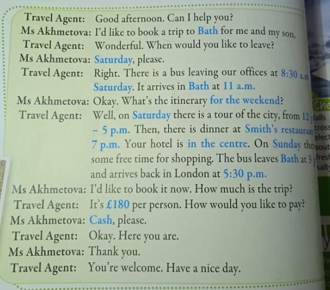 Турагент: Добрый день. Я могу вам помочь? Г-жа Ахметова: Я бы хотела заказать поездку в Бат для себя и турагента: Замечательно. Когда бы вы хотели уехать? Ахметова: В субботу, пожалуйста. Турагент: Верно. Автобус отправляется из нашего офиса в 8:30, сын мой. Суббота. Приходит в Бат в 11.00. Ахметова: Хорошо. Какой маршрут на выходные? Турагент: Ну, в субботу экскурсия по городу, с 12 до 17 часов. Затем ужин в ресторане Смита. Ваш отель находится в центре. В воскресенье в 19:00. немного свободного времени для покупок. Автобус отправляется из Бата в 3 часа и возвращается в Лондон в 17:30. Г-жа Ахметова: Забронирую сейчас. Сколько стоит поездка? Турагент: 180 фунтов на человека. Как бы вы хотели заплатить? Г-жа Ахметова: Наличными, пожалуйста. Турагент: Хорошо. Держи. Г-жа Ахметова: Спасибо. Турагент: Пожалуйста. Хорошего дня.