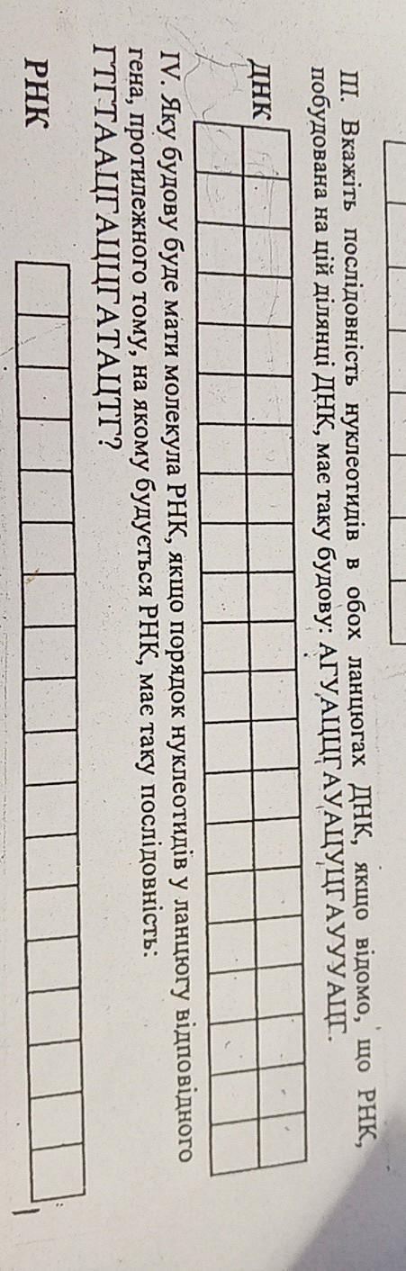 II. Вкажіть послідовність нуклеотидів в обох ланцюгах ДНК, якщо відомо, що РНК, побудована на цій ділянці ДНК, має таку будову: АГУАЦЦГАУАЦУЦГАУУУАЦІ. ДНК IV. Яку будову буде мати молекула РНК, якщо порядок нуклеотидів у ланцюгу відповідного гена, протилежного тому, на якому будується РНҚ, має таку послідовність: ГТГТААЦГАЦЦГАТАЦТГ? РНК