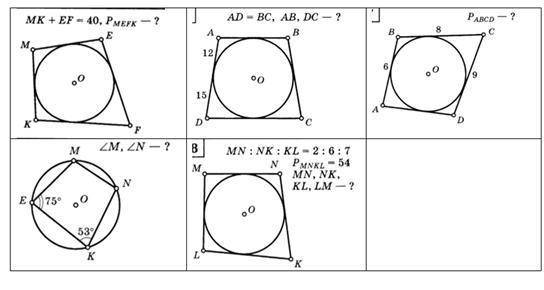 В четырехугольник можно вписать окружность, если сумма противоположных сторон равна сумме двух других противоположных сторон.