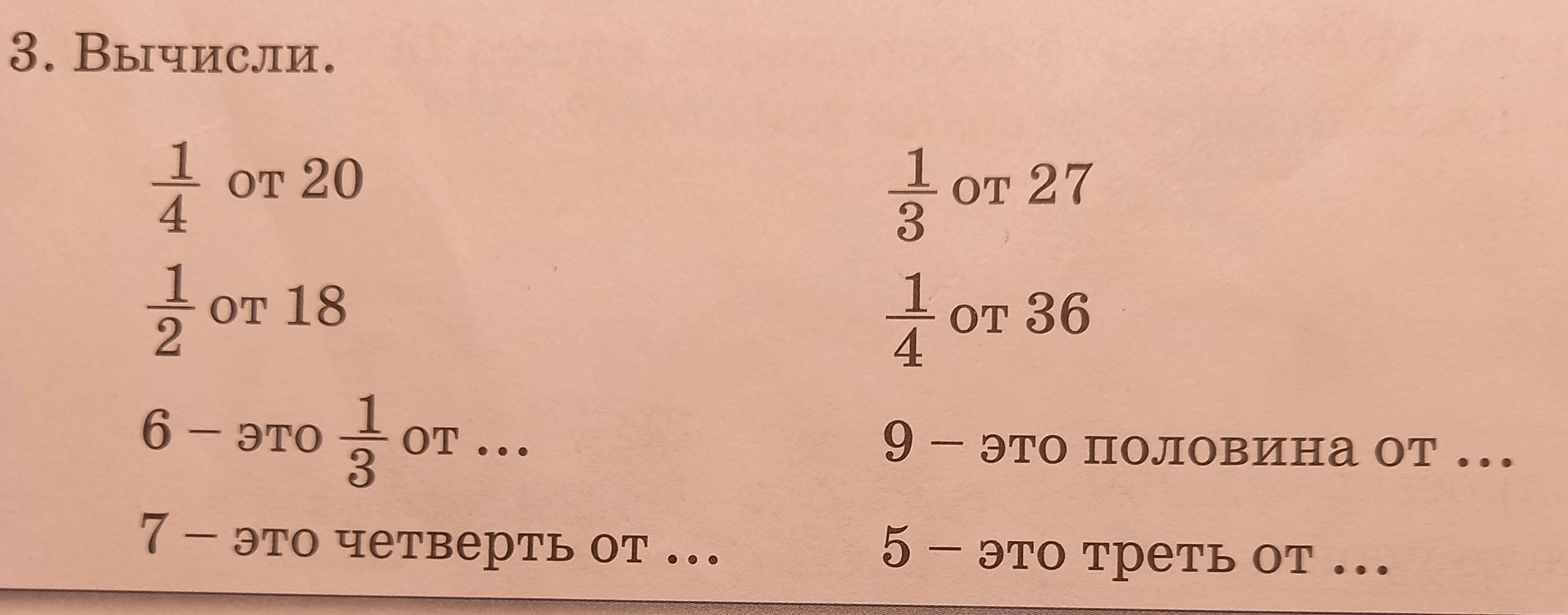 привет вот второй. 1/3 от 27=27÷3×1=9 1/4 от 36=36÷4×1=9. 9 это половина от =9×2=18. 5это треть от =5×3=15