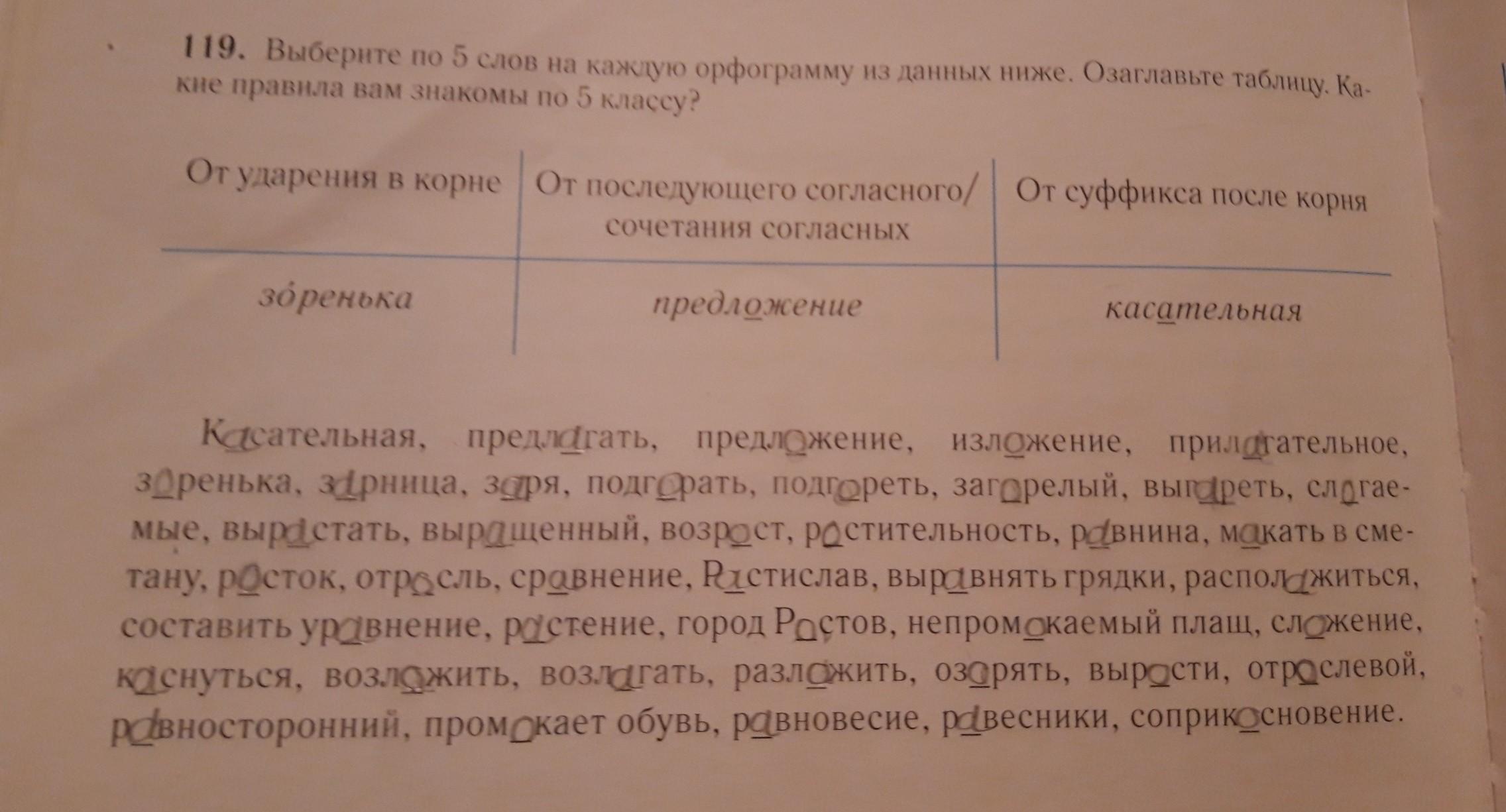 119. Выберите по 5 слов на каждую орфограмму из данных ниже. Озаглавьте таблицу. Какие правила вам знакомы по 5 классу?