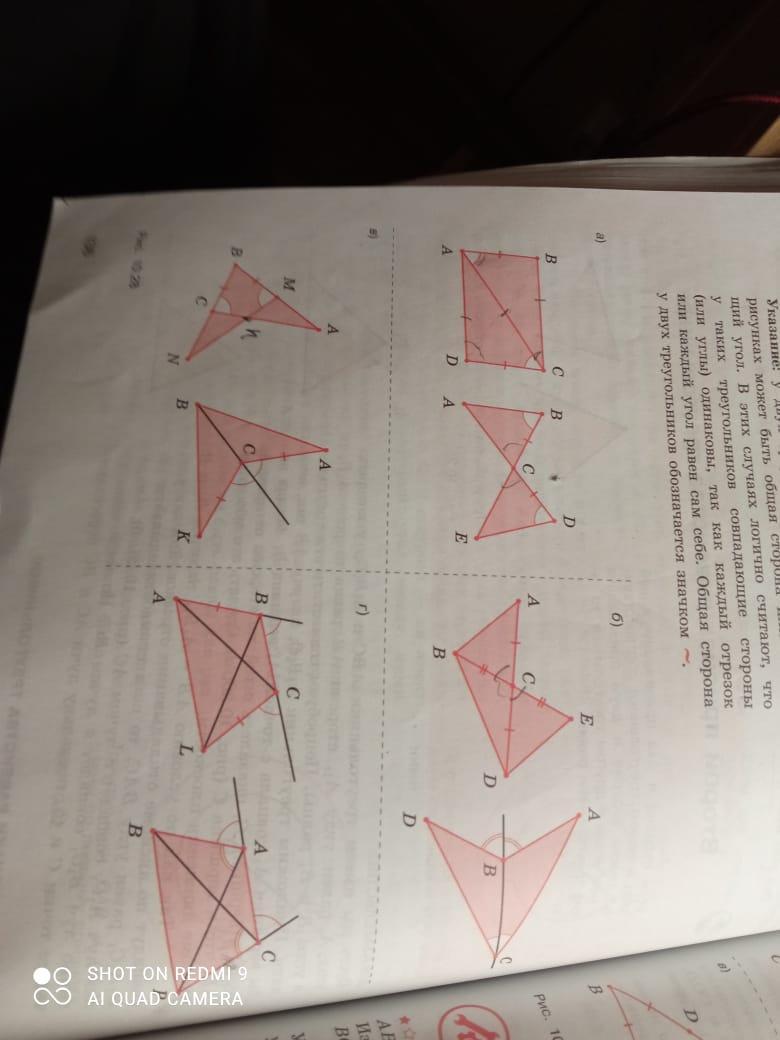 Найдите на рисунке 10.28 пары равных треугольников и докажите их равенство . На чертежах равные отрезки обозначены одинаковыми штрихами , а равные углы - одинаковыми дугами . Нужно в,г
