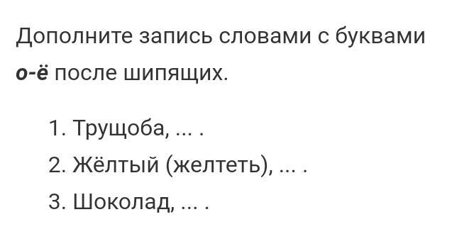 2) жёлтый (желтеть), чёрный (чернеть), шёпот (шептать), шёлк (шелка), пшёнка (пшено), пчёлка (пчела), дешёвый (дешевизна).