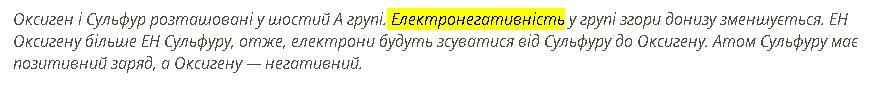 Б)Оксиген і Сульфур розташовані у шостий А групі. Електронегативність у групі згори донизу зменшується. ЕН Оксигену більше ЕН Сульфуру, отже, електрони будуть зсуватися від Сульфуру до Оксигену. Атом Сульфуру має позитивний заряд, а Оксигену — негативний.