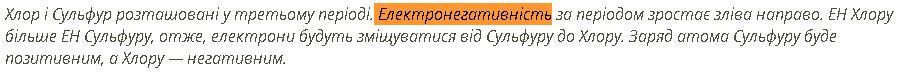 А) Хлор і Сульфур розташовані у третьому періоді. Електронегативність за періодом зростає зліва направо. ЕН Хлору більше ЕН Сульфуру, отже, електрони будуть зміщуватися від Сульфуру до Хлору. Заряд атома Сульфуру буде позитивним, а Хлору — негативним.