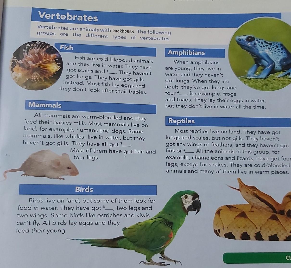 2 Read and listen to the text. Check your answers in exercise 1. Then answer the questions. 1 Which type of animal doesn't live on land? 2 Which types of animal have got scales? 3 Which type of animal has got hair? 4 How are snakes different from other reptiles? 5 Which type of animal is different when it's older? 6 Which type of animal feeds its babies milk?