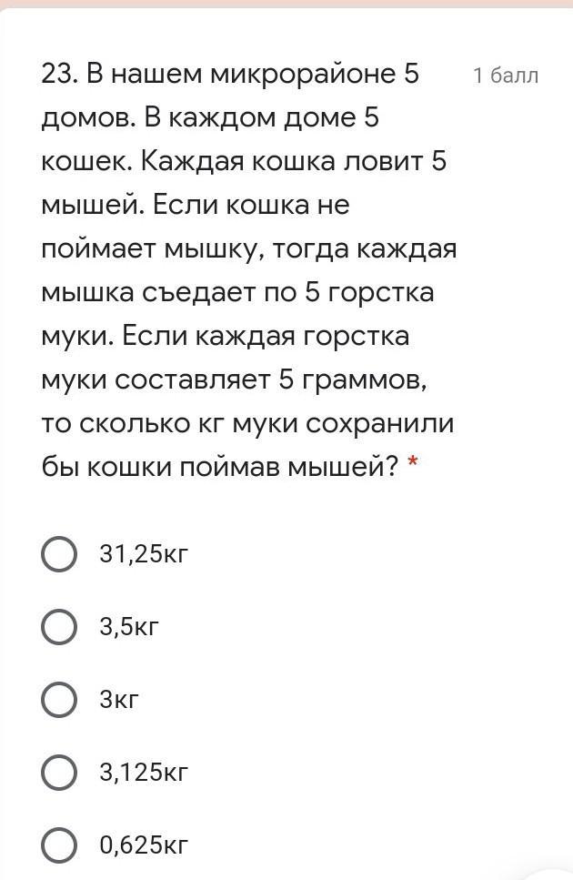 В нашем микрорайоне 5 домов. В каждом доме 5 кошек. Каждая кошка ловит 5 мышей. Если кошка не поймает мышку, тогда каждая мышка съедает по 5 горстка муки. Если каждая горстка муки составляет 5 граммов, то сколько кг муки сохранили бы кошки поймав мышей? *