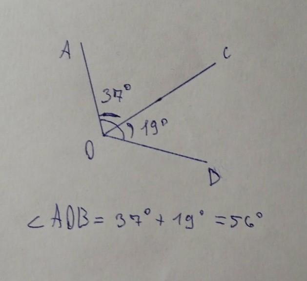 ∠АОВ = ∠АОС + ∠ВОС = 37° + 19° = 56°