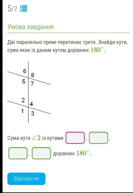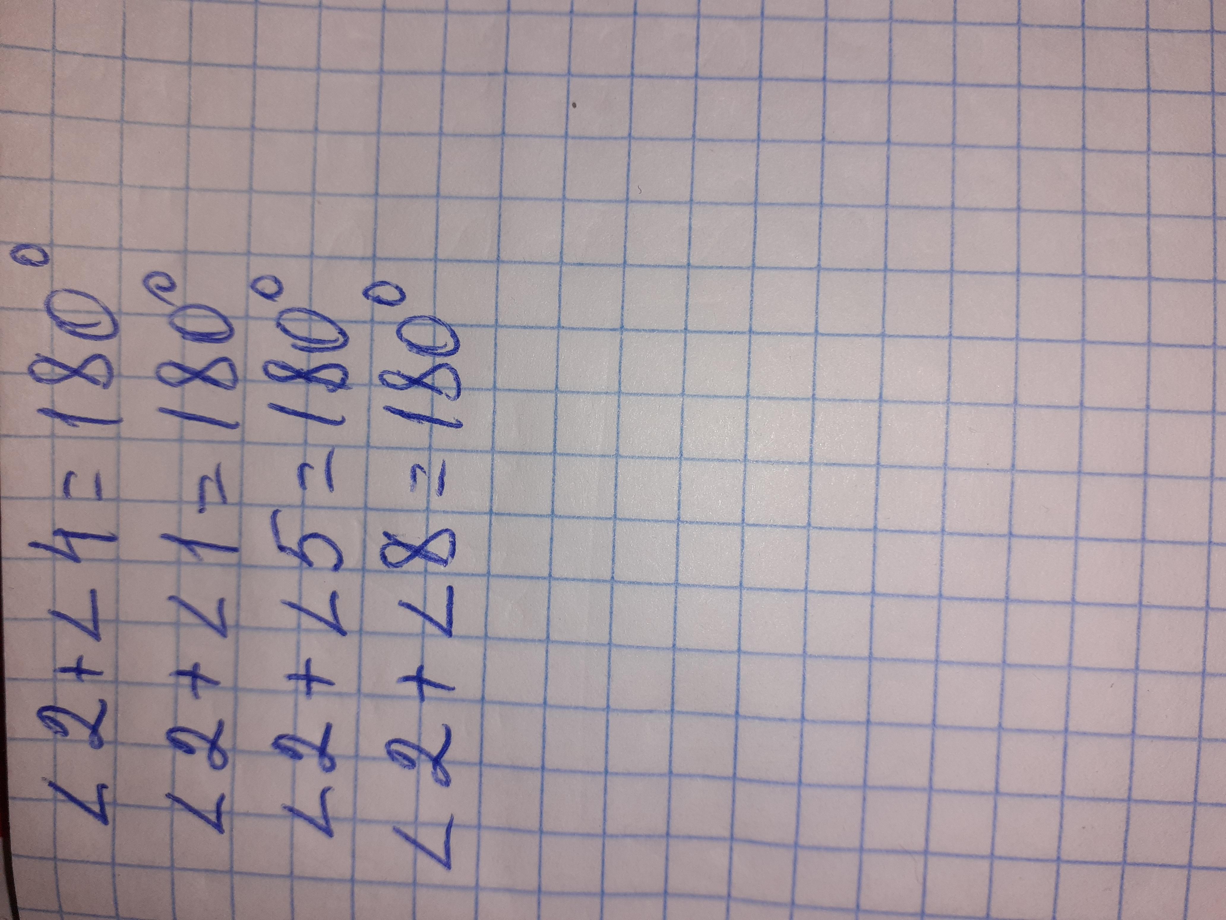 ∠2 с углами ∠1, ∠4 ,(потому что они смежные)∠5(они внутренние односторонние при параллельных прямых)∠8 равна 180°