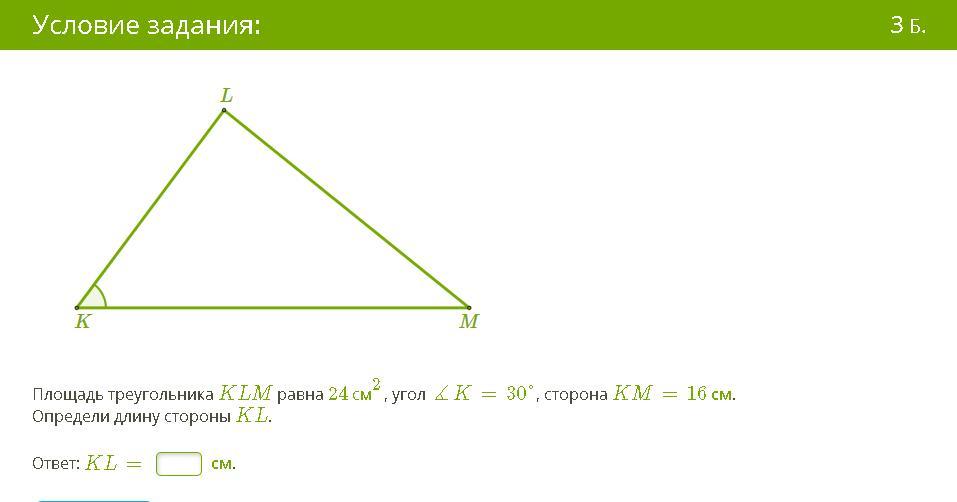 Площадь треугольника KLM равна 24 см2, угол ∡K=30°, сторона KM=16 см.