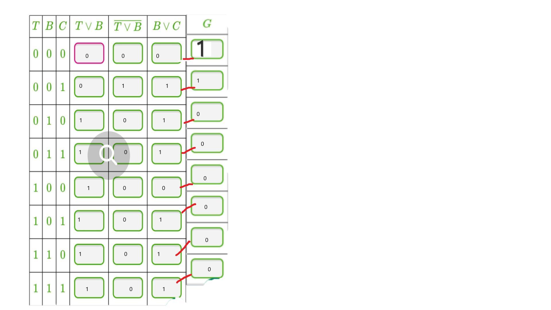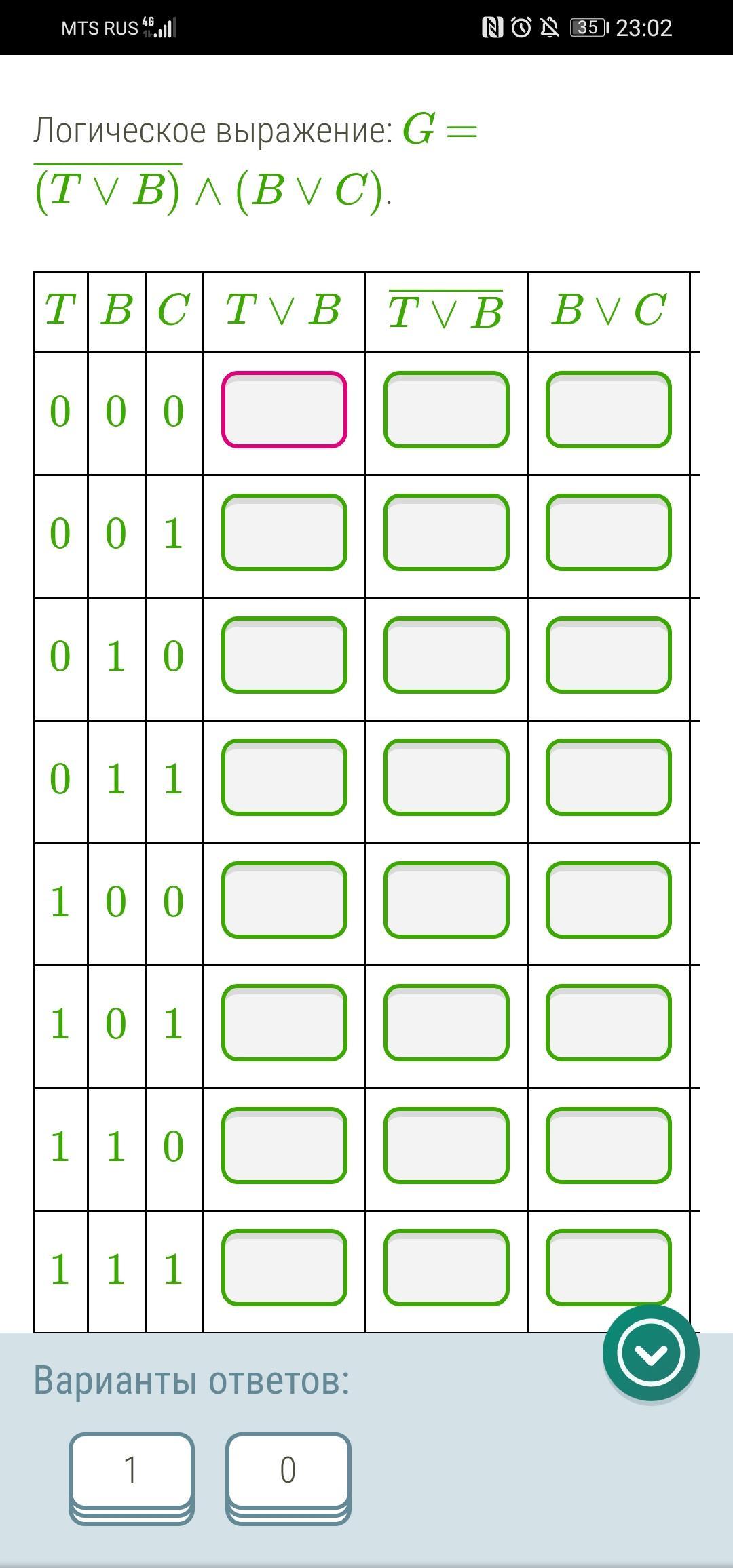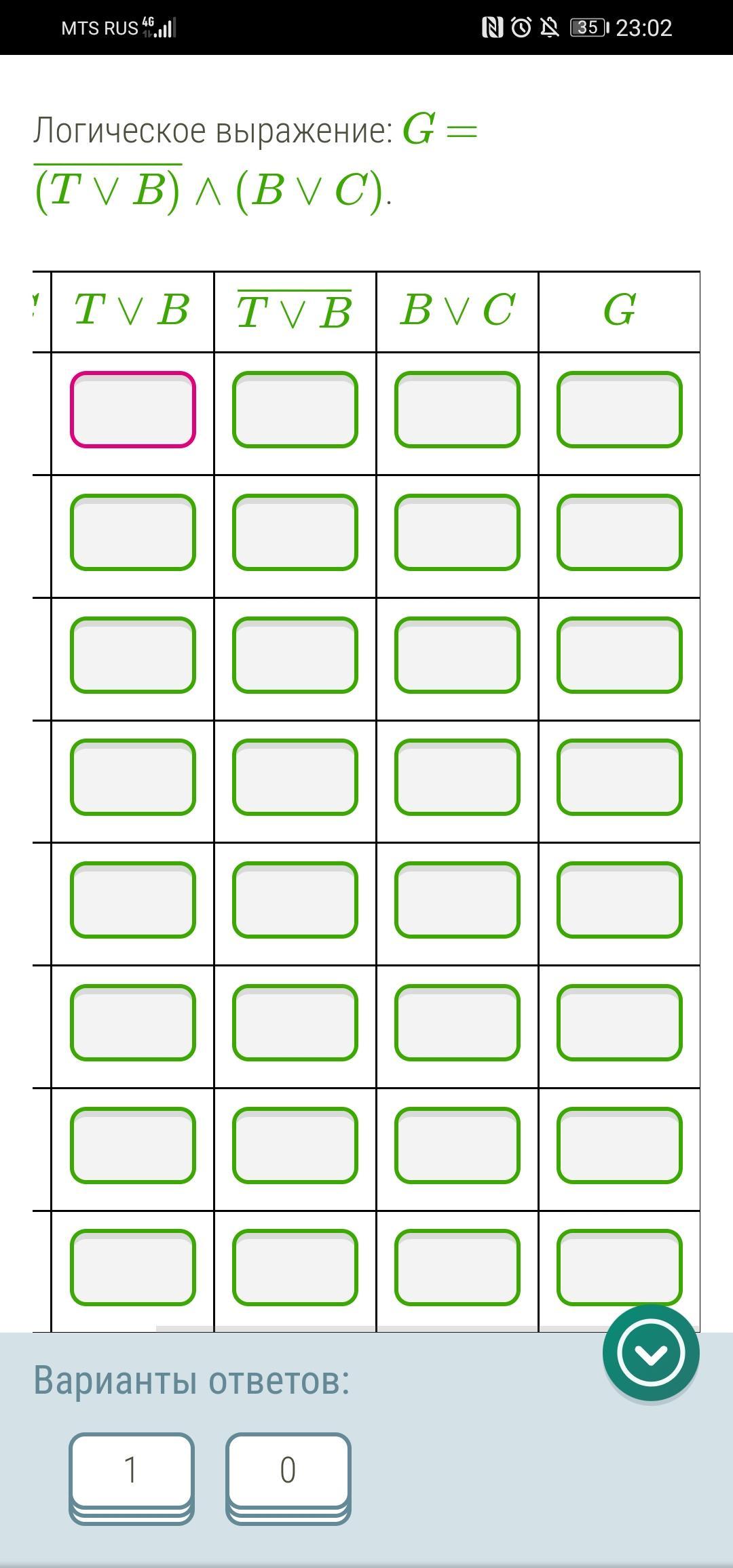 Логическое выражение: G = (T∨B)¯¯¯¯¯¯¯¯¯¯¯∧(B∨C).