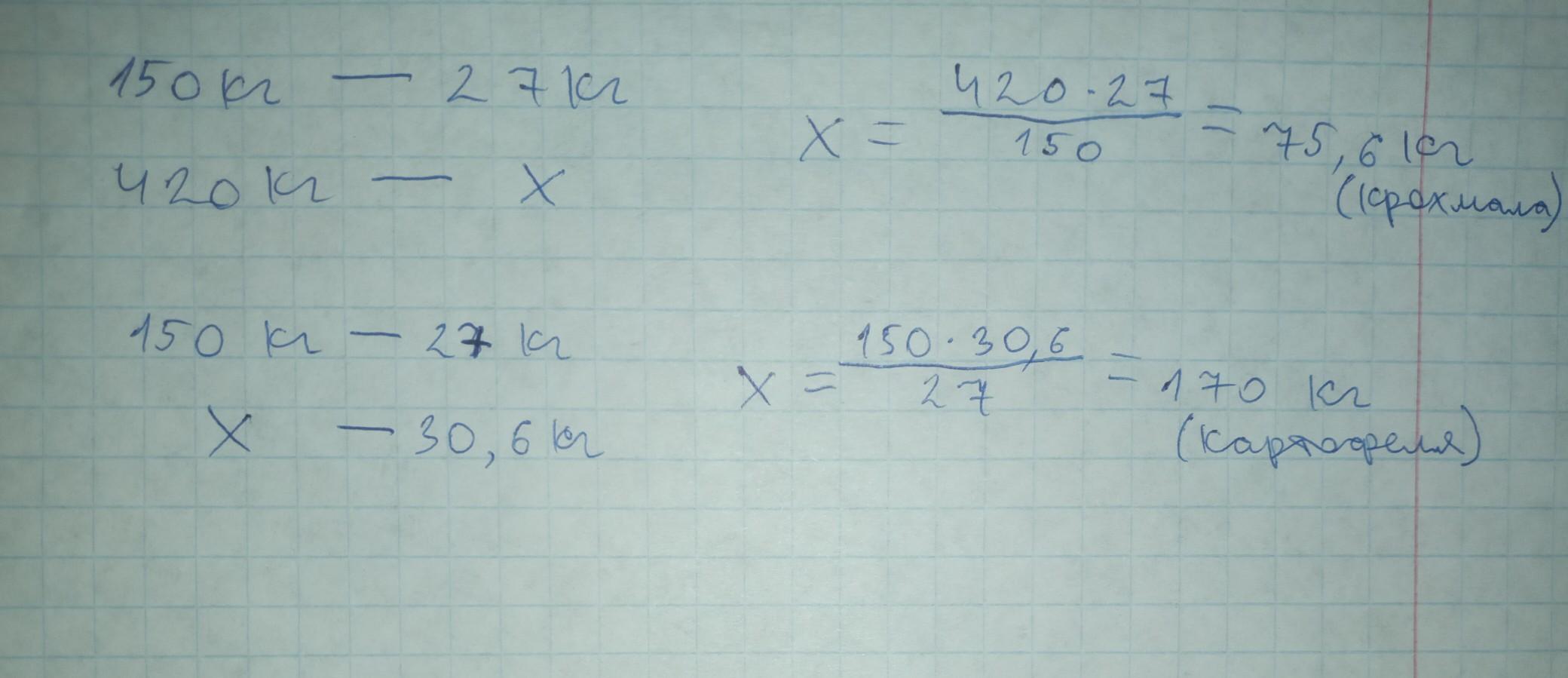 Из 150 кг картофеля получают 27 кг крахмала. Сколько крахмала получают из 420 кг картофеля? Сколько картофеля нужно чтобы получить 30,6кг крахмала?