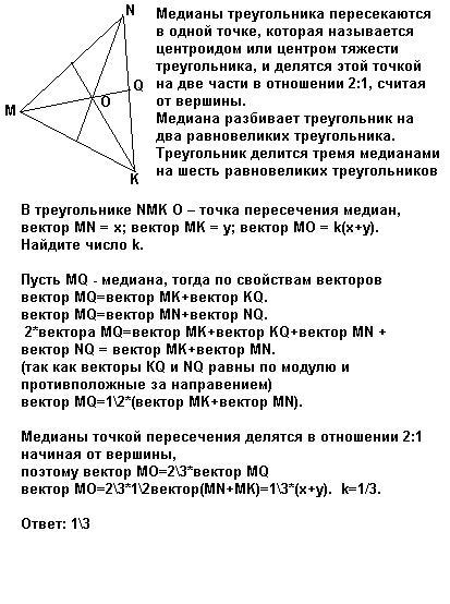 В треугольнике MNK точка О — точка пересечения медиан, MN = а, МК = у, МО = k (х + у). Найдите число k