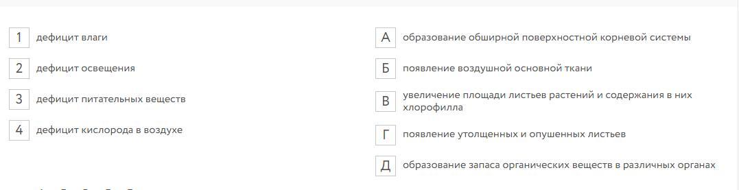Установите соответствие между видами неблагоприятных условий существования (1-4) и способами приспособления к ним (А-Д).