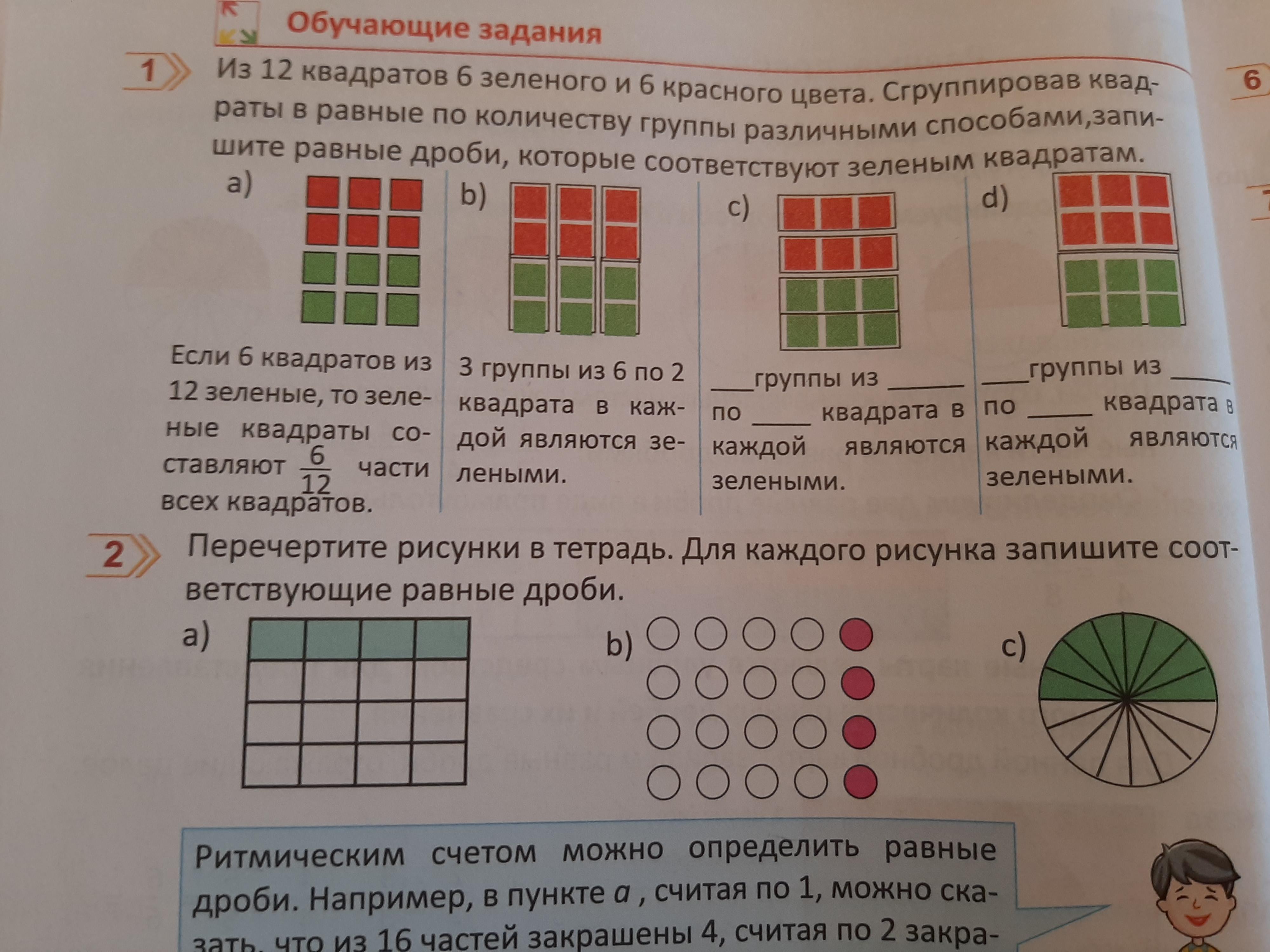 Из 12 квадратов 6 зеленого и 6 красных цвета. Сгруппировав квадраты в равные по количеству группы различными способами, запишите равнве дроби, которые соответствует зеленым квадратам.