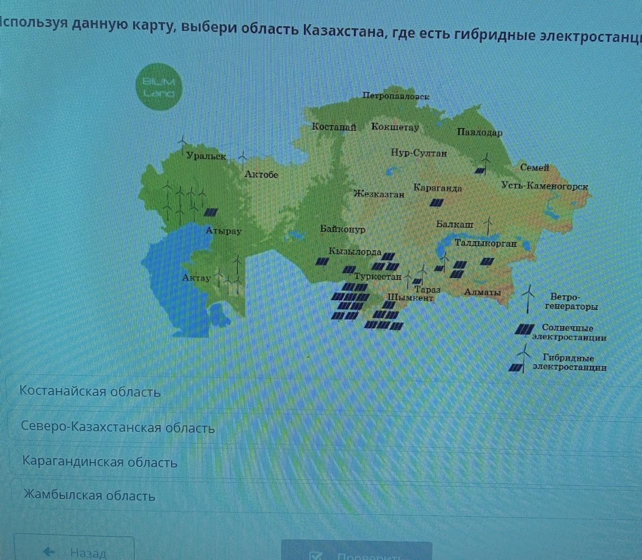 используя данную карту выберите область Казахстана где есть гибридные электростанции
