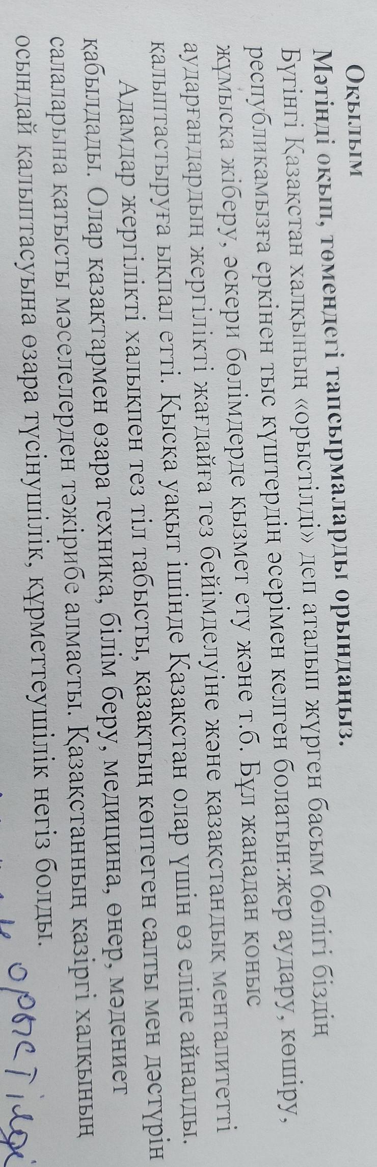 3-тапсырма. Екі бағандағы сөздерді мағына жақындығына қарай сәйкестендір жазыңыз. (3 балл) 1. Қысқа уақыт ішінде Қазақстан A, қазақтың көптеген сатты мен дәстүрін қабылдады. 2. Адамдар жергілікті халықпен тез тіл В, өзара түсінушілік, құрметтеушілік табысты, негіз болды. 3. Қазақстанның қазіргі халқының С.барлығы үшін өз еліне айналды осындай қалыптасуына