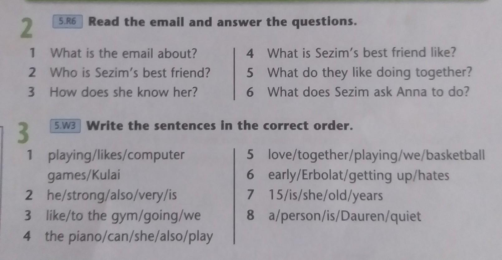 2 5.R6 Read the email and answer the questions. 1 What is the email about? 2 Who is Sezim's best friend? 3 How does she know her? 4 What is Sezim's best friend like? 5 What do they like doing together? 6 What does Sezim ask Anna to do? 5.W3 Write the sentences in the correct order. 3 1 playing/likes/computer 5 love/together/playing/we/basketball games/Kulai 6 early/Erbolat/getting up/hates 2 he/strong/also/very/is 7 15/is/she/old/years 3 like/to the gym/going/we 8 a/person/is/Dauren/quiet 4 the piano/can/she/also/play