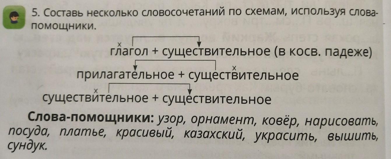 5. Составь несколько словосочетаний по схемам, используя слова- помощники. глагол + существительное (в косв. падеже) прилагательное + существительное существительное + существительное Слова-помощники: узор, орнамент, ковёр, нарисовать, посуда, платье, красивый, казахский, украсить, вышить, сундук. 38