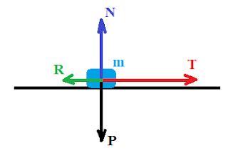 На рисунке R- сила трения, N- сила реакции опоры, T- сила тяги двигателей, P - сила тяжести.