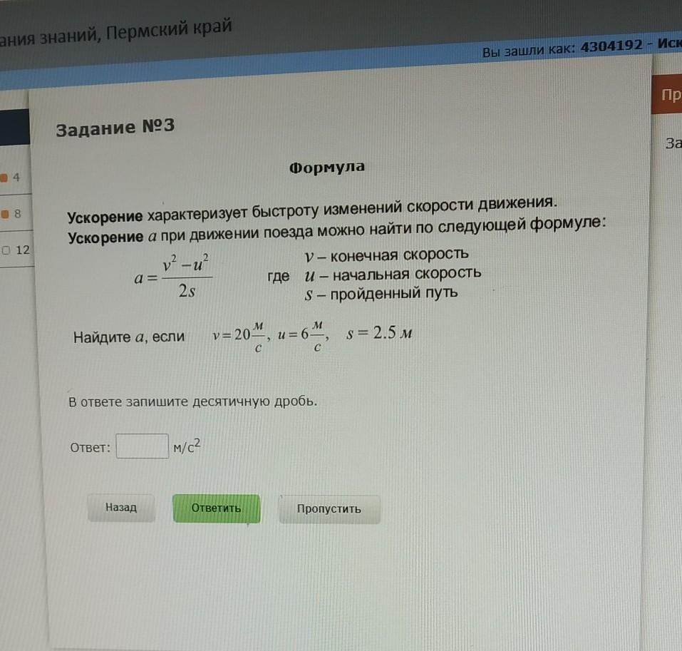 Якщо v = 20 м/с, u = 6 м/с, s = 2,5 м , то a = ( 20² - 6² )/( 2*2,5) =