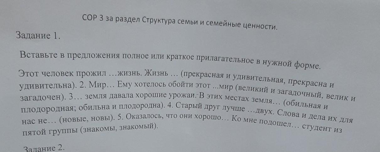 Задание 1. Вставьте в предложения полное или краткое прилагательное в нужной форме. Этот человек прожил ... Жизнь. Жизнь ... (прекрасная и удивительная, прекрасна и удивительна). 2. Мир... Ему хотелось обойти этот ...мир (великий и загадочный, велик и загадочен). 3... земля давала хорошие урожай. В этих местах земля... (обильная и плодородная; обильна и плодородна). 4. Старый друг лучше ...двух. Слова и дела их для нас не... (новые, новы). 5. Оказалось, что они хорошо... Ко мне подошел... студент из пятой группы (знакомы, знакомый). Задание 2. на место пропусков подходящие по смыслу при пап