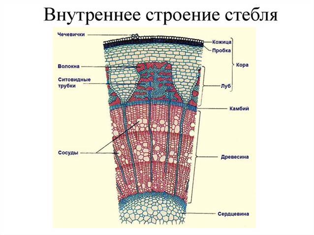 Стебель древесного растения обычно состоит из четырех слоев: коры, камбия, древесины и сердцевины. При этом каждый слой может включать клетки разных тканей. Так в состав коры входят кожица, пробка, лубяные волокна, ситовидные трубки и другие ткани.